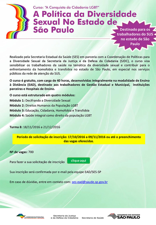 CURSO: A CONQUISTA DA CIDADANIA LGBT - TURMA 8 Período de solicitação de inscrição: 17/10/2016 a 09/11/2016 ou até o preenchimento das vagas oferecidas