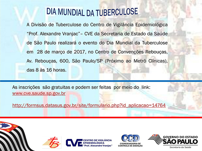 DIA MUNDIAL DA TUBERCULOSE A Divisão de Tuberculose do Centro de Vigilância Epidemiológica "Prof. Alexandre Vranjac" CVE da Secretaria de Estado da Saúde de São Paulo realizará o evento do Dia Mundial da Tuberculose em 28 de março de 2017.