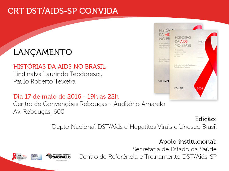 A Coordenação Estadual DST/Aids-SP convida para o lançamento do livro "Histórias da aids no Brasil", de autoria de Paulo Roberto Teixeira e Lindinalva Laurindo Teodorescu. O evento será realizado no próximo dia 17 de maio de 2016, no Centro de Convenções Rebouças (Av. Rebouças, 600 - Auditório Amarelo), das 19 às 22h30.