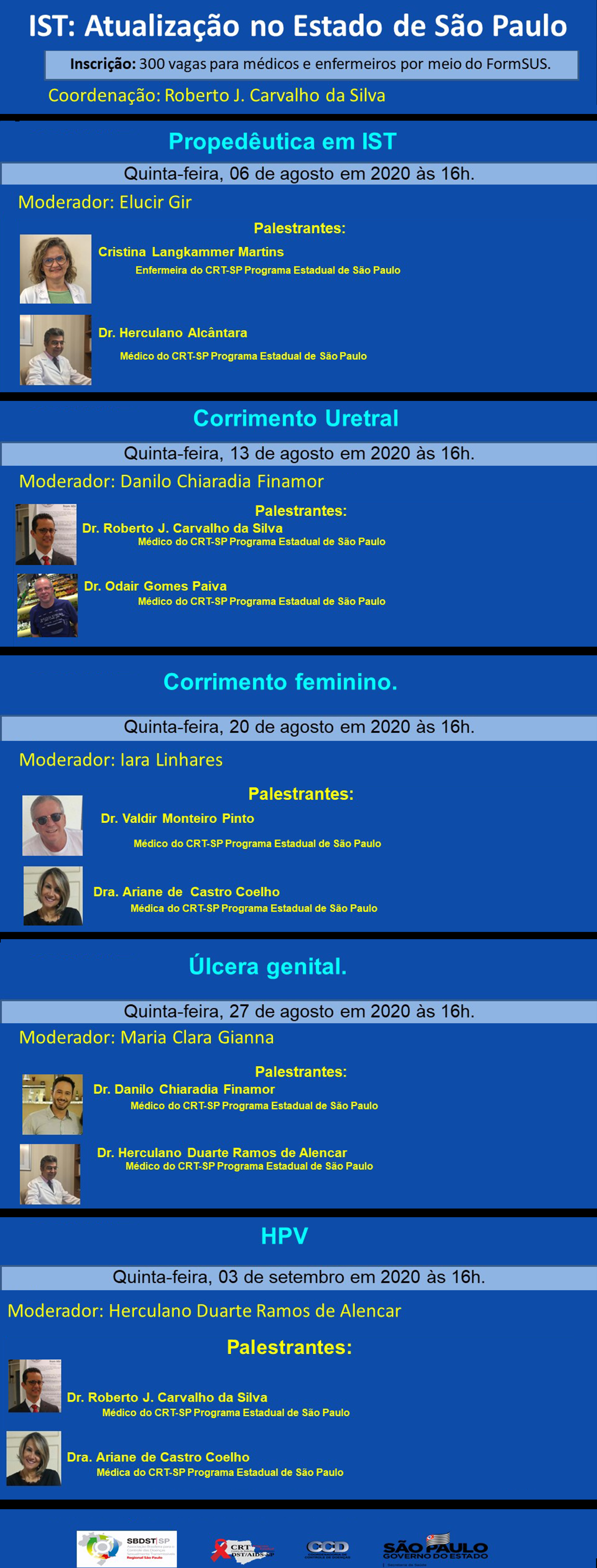 O Centro de Referência e Treinamento DST/Aid-SP, Programa Estadual DST/Aids-SP, convida gestores e profissionais da saúde para o evento online “IST: Atualização no Estado de São Paulo”, a ser realizado nos dias 06, 13, 20 e 27 de agosto e 03 de setembro de 2020, sempre das 16 às 18h. O encontro tem por objetivo atualizar os profissionais da rede sobre as diretrizes do último Protocolo Clínicos e Diretrizes de Tratamento de IST (PCDT IST). O evento será realizado pela plataforma Zoom. Estamos enviando a programação com os temas de cada encontro. O público alvo (médicos e enfermeiros) deverá se inscrever pelo link http://formsus.datasus.gov.br/site/formulario.php?id_aplicacao=57739 até o dia 03 de setembro para garantir sua vaga e seu certificado. Solicitamos que no momento do acesso ao link de transmissão da Web que será enviado em breve, identifiquem-se corretamente preenchendo: seu município, nome e a unidade em que trabalha.