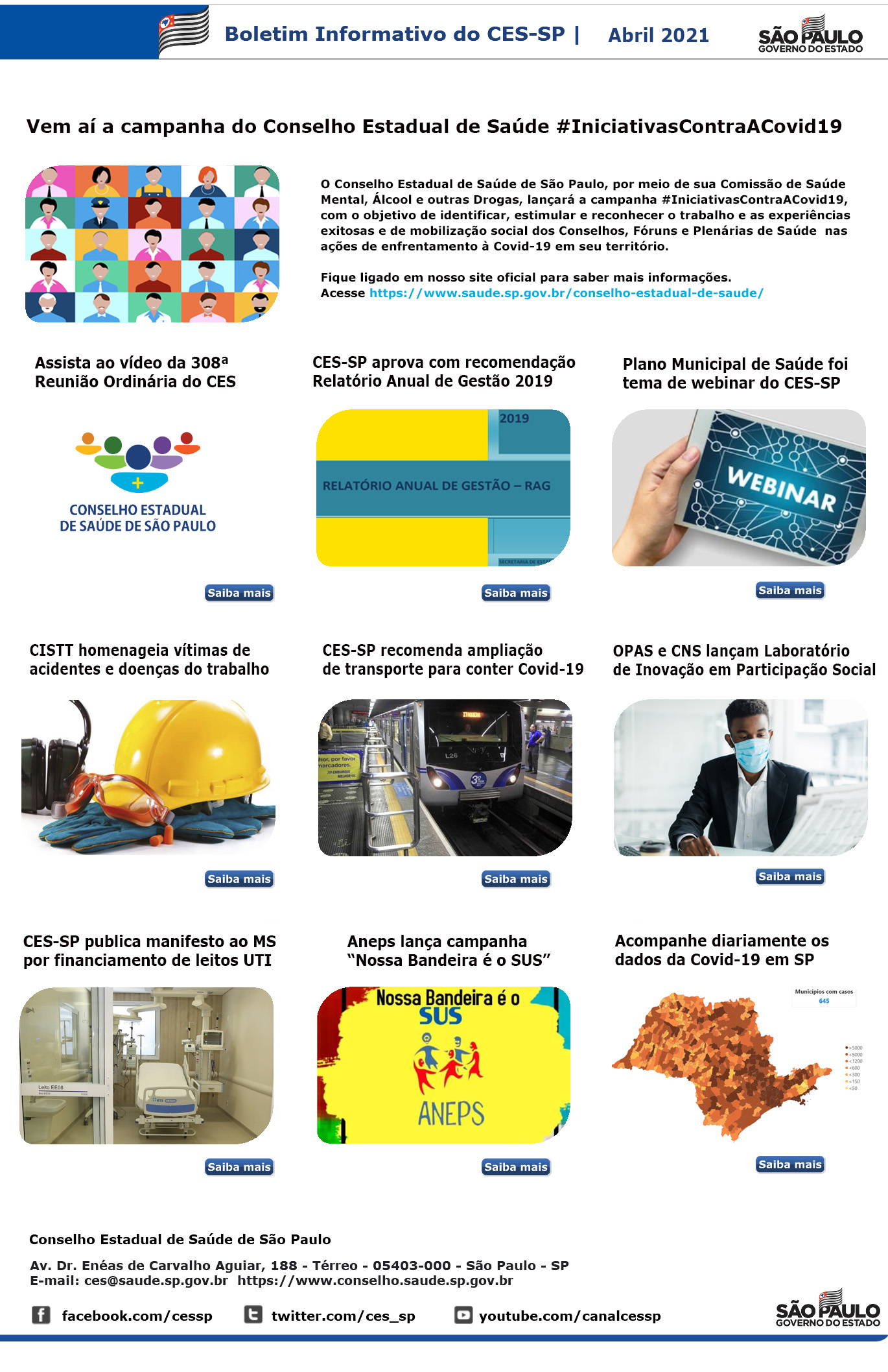 Acesse os últimos informativos do CES-SP Clique nas imagens para ler na íntegra os Boletins Informativos de 2021 Última edição: maio /2021 Edições anteriores 01 02 03 04 05 06 07 08 09 10 11 12 13 14 15 16 17