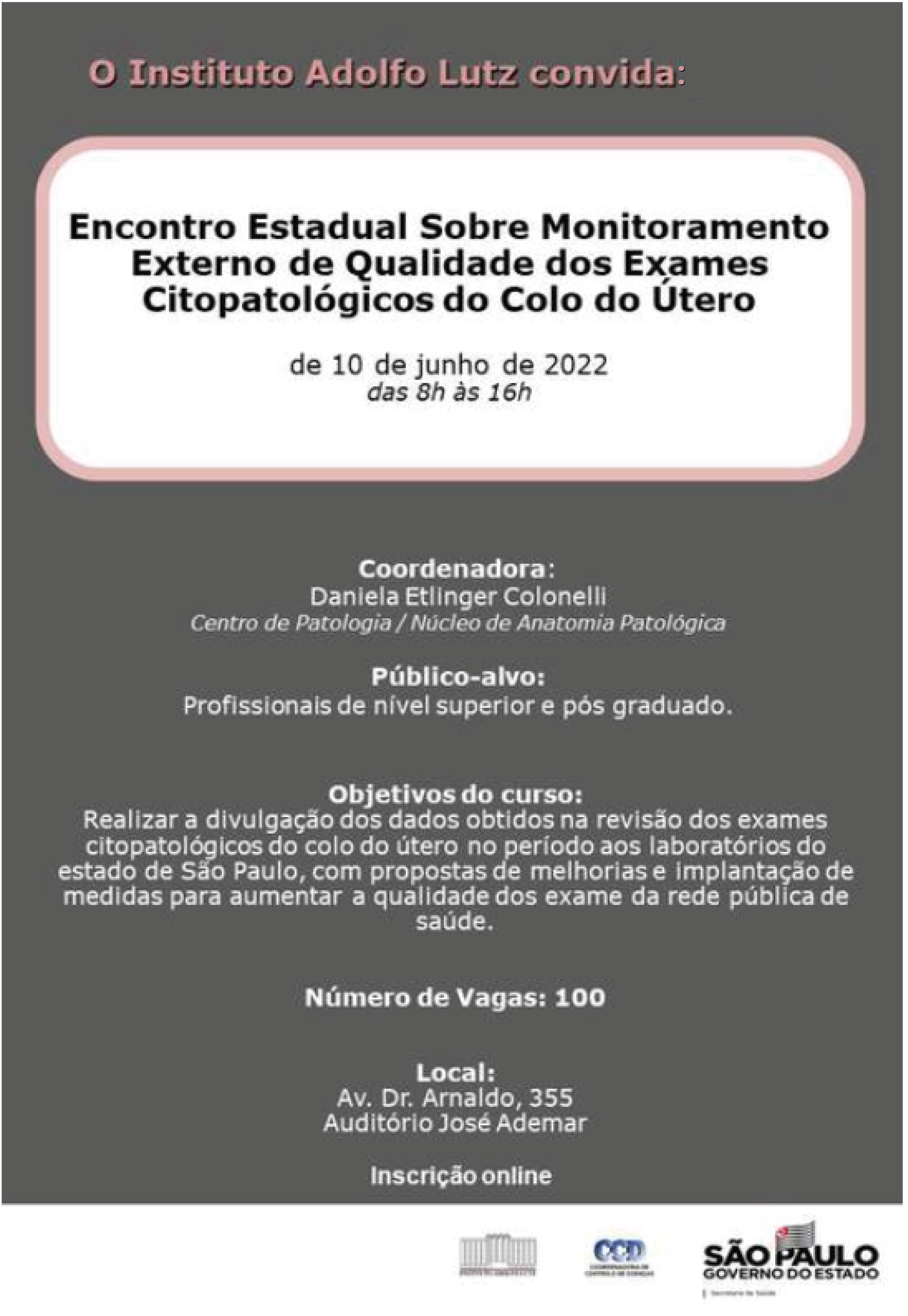 04/05/2022 - Encontro Estadual sobre Monitoramento Externo de Qualidade dos Exames Citopatológicos do Colo do Útero (10/06) Inscrições Programação do evento