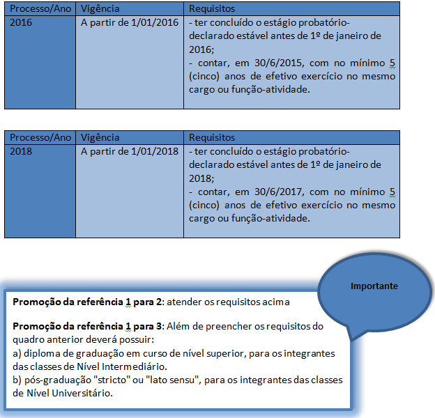 Servidores de nível intermediário (oficial administrativo, oficial operacional, oficial sociocultural) ou de nível universitário (analista administrativo, analista sociocultural, analista de tecnologia e executivo público), enquadrados na referência 1 (que ainda não obtiveram promoção), que atenderem cumulativamente os seguintes requisitos: