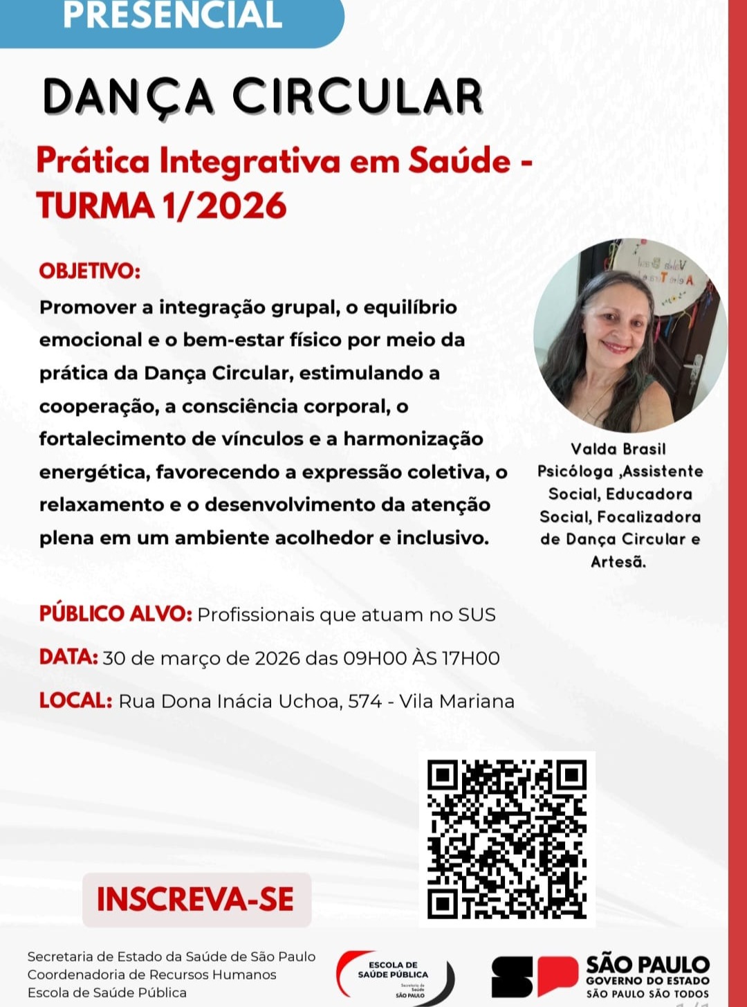 Dia 30/03/2026, nós da Escola de Saúde Pública, receberemos Valda Brasil para realizar uma Oficina de Dança Circular - Turma I/2026. A Dança Circular é um dos recursos das PICS - Práticas Integrativas em Saúde.