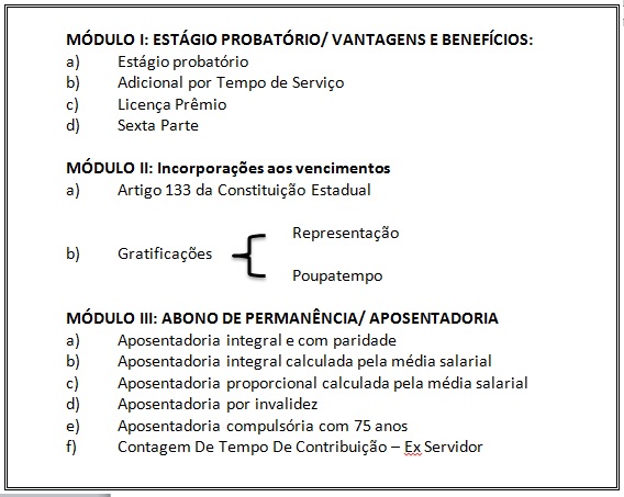 Organizado em módulos temáticos, o encontro deste ano visa capacitar os órgãos subsetoriais para a contagem direcionada à concessão de vantagens, às incorporações aos vencimentos e à aposentadoria dos servidores da SES, conforme segue: