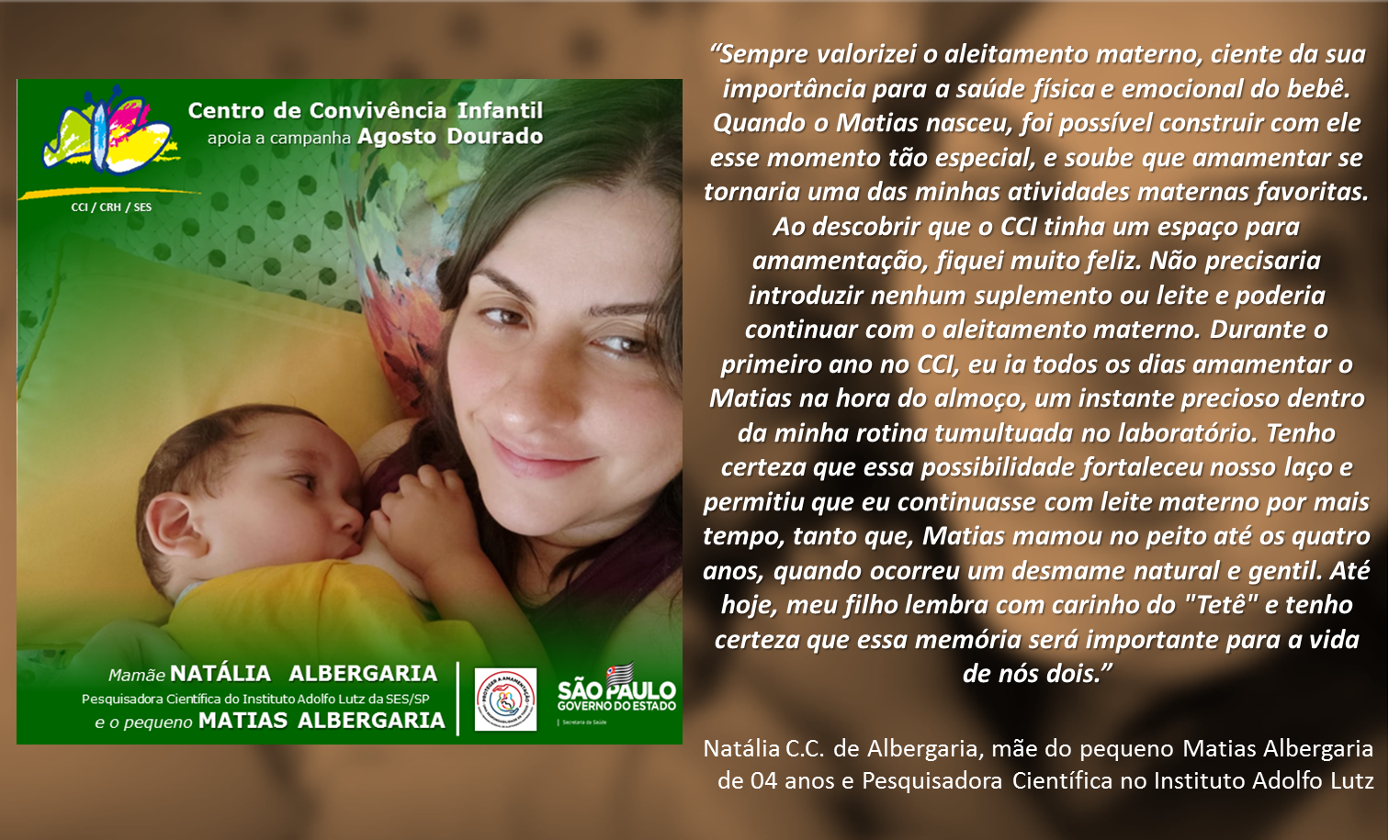 Durante o mês de agosto realiza-se na área da saúde a campanha "Agosto Dourado" que busca destacar a luta pelo incentivo à amamentação, observando que a cor dourada está relacionada ao padrão ouro de qualidade do leite materno, e entre os dias 01 a 07 de agosto, realiza-se a Semana Mundial de Aleitamento Materno, que este ano tem como tema "Proteger a Amamentação: uma responsabilidade de todos", ação que o CCI vem reforçando desde a implantação de sala acreditada pelo Ministério da Saúde, exclusiva para o aleitamento materno, que recebe mães trabalhadoras da SES-SP e seus bebês.