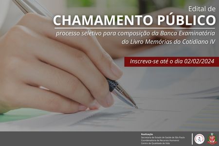 Em atendimento ao Edital publicado em 11/12/2023, para o recebimento das narrativas que irão compor o livro Memórias do Cotidiano IV, a Coordenadoria de Recursos Humanos CRH/SES-SP por meio do Centro de Qualidade de Vida, dá transparência ao edital de CHAMAMENTO PÚBLICO, para o recebimento das inscrições de composição da Banca Examinadora.