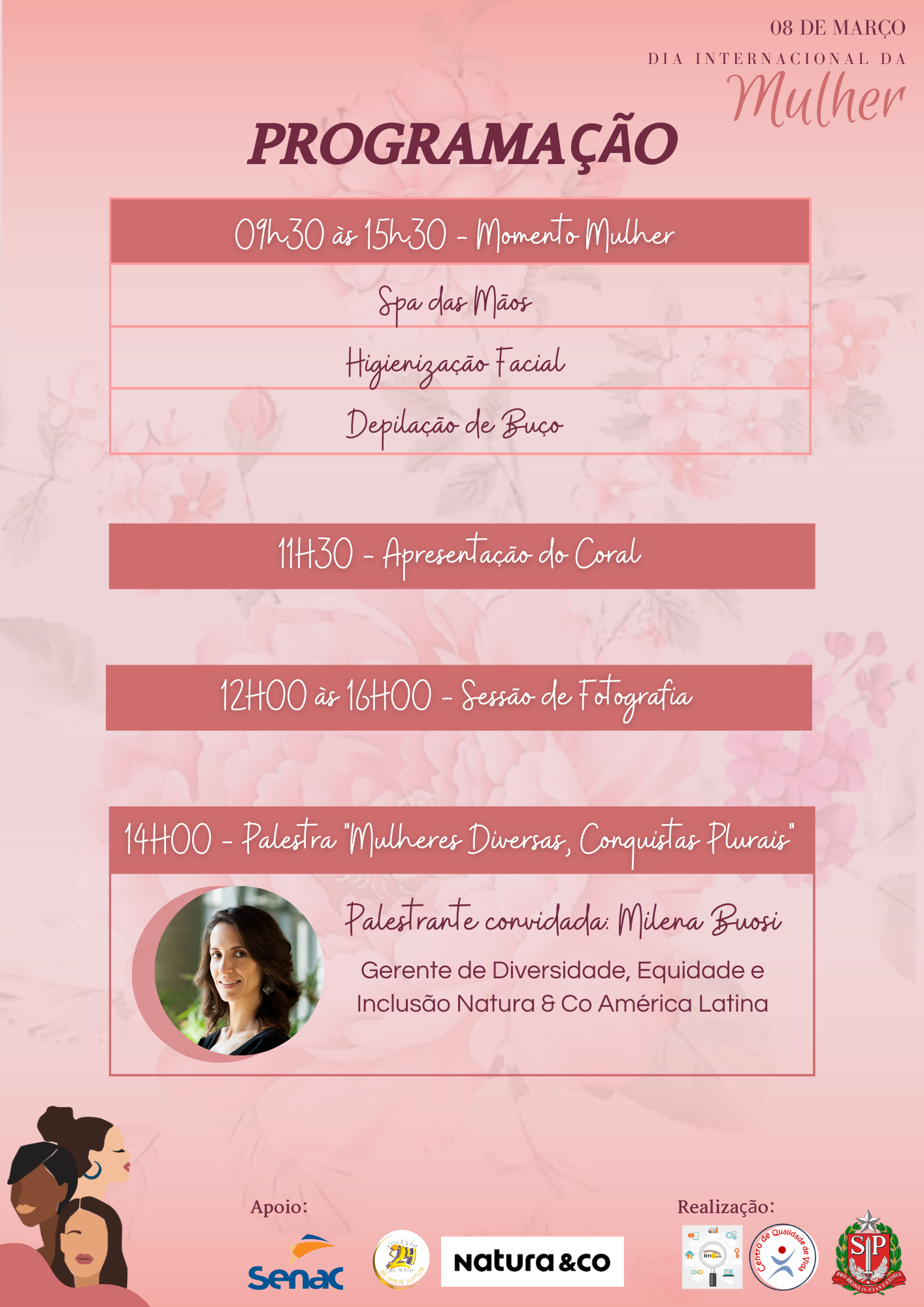 Esta data contém em sua programação a Palestra “Mulheres Diversas, Conquistas Plurais”, que será ministrada por Milena Buosi, Gerente de Diversidade e Estratégias de Desenvolvimento Organizacional para América Latina / Natura & Co.