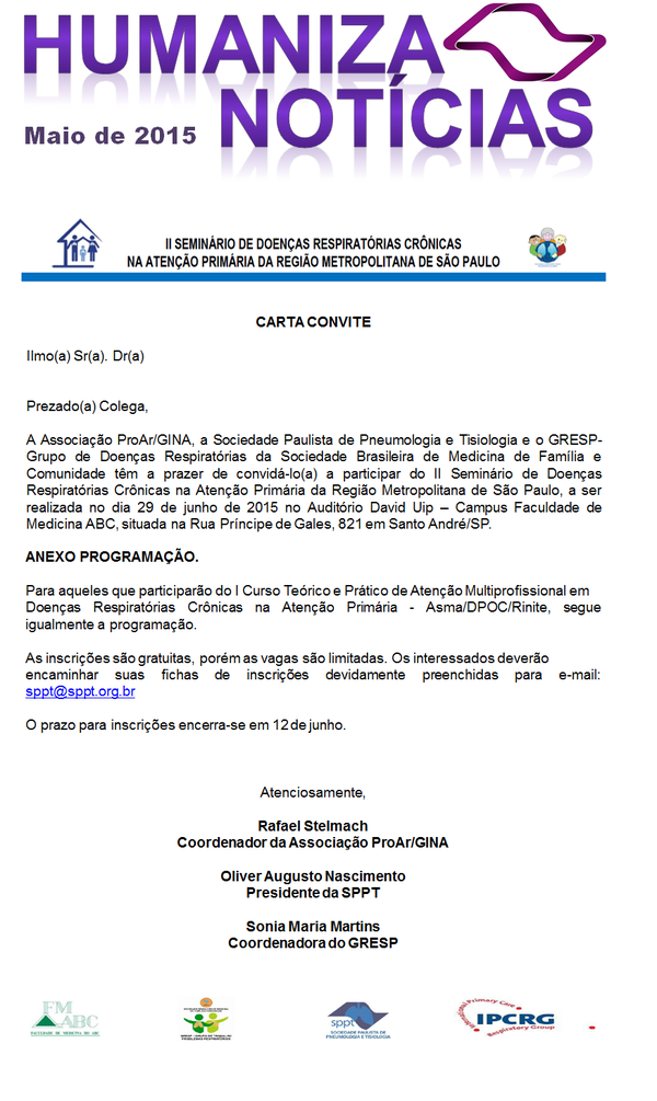 Seminário de Doenças Respiratórias Crônicas Para acessar a Programação do Seminário, clique aqui. Para acessar a Ficha de Inscrição, clique aqui.
