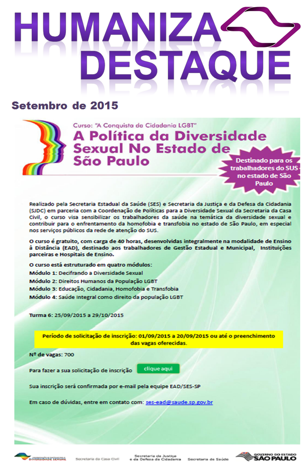 Turma 6 - Curso Diversidade Sexual Para fazer inscrição, clique no link: http://formsus.datasus.gov.br/site/formulario.php?id_aplicacao=22436