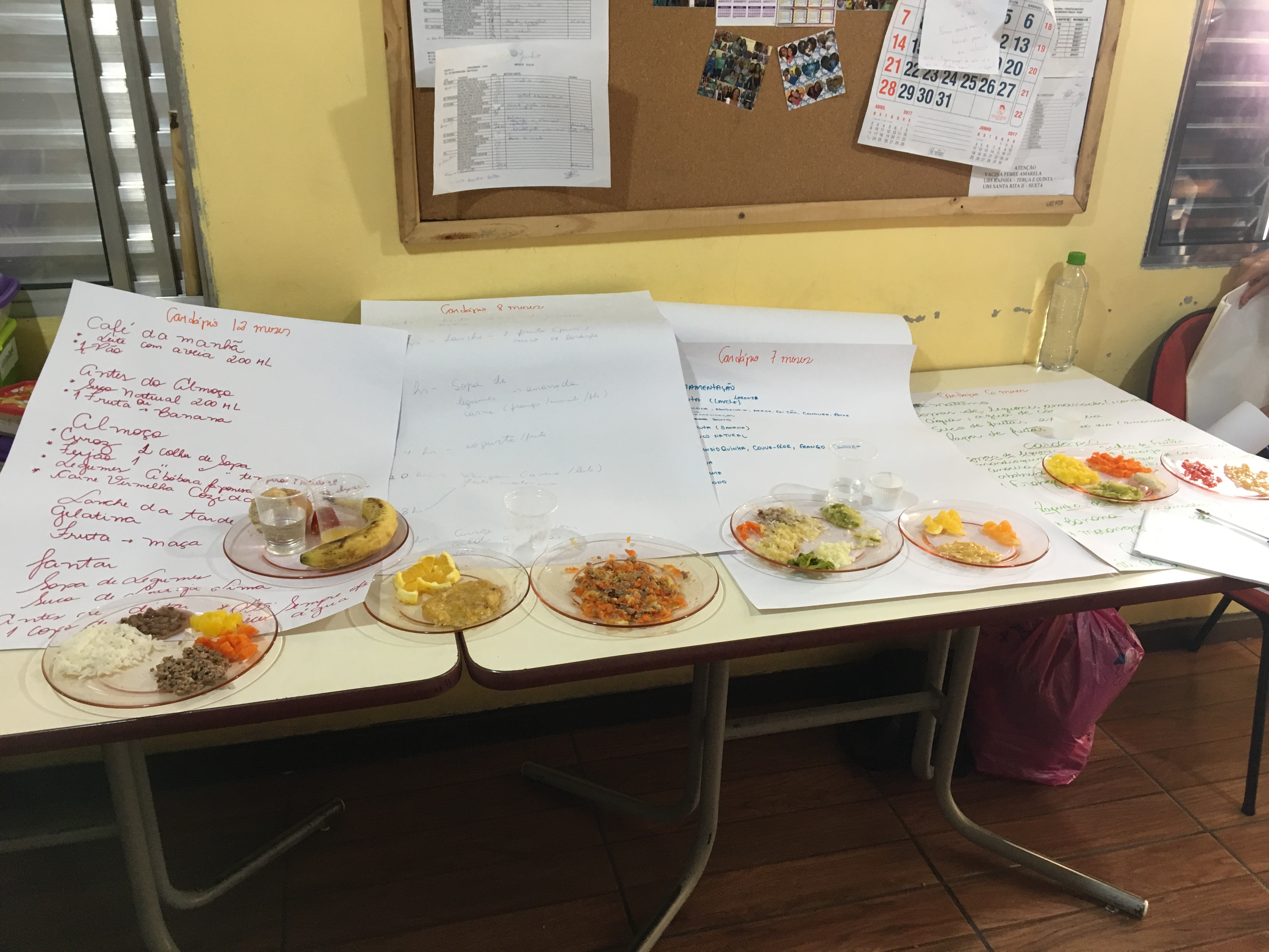 Outra atividade importante foi montar cardápios para crianças nas faixas de 6, 7, 8 meses e 1 ano como achassem correto para cada faixa etária. Eu já levei os alimentos pré-cozidos, pertencentes a todos os grupos alimentares (leguminosas, cereais, raízes e tubérculos, carnes e ovos, legumes e verduras e frutas).