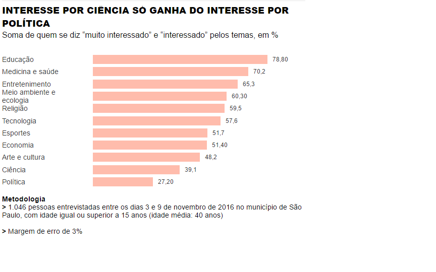 Uma pesquisa coordenada pelo Instituto Butantan, realizada no município de São Paulo, revelou que somente 39% dos paulistanos possuem interesse pela ciência, colocando o tema em penúltimo lugar entre os apresentados nas entrevistas.