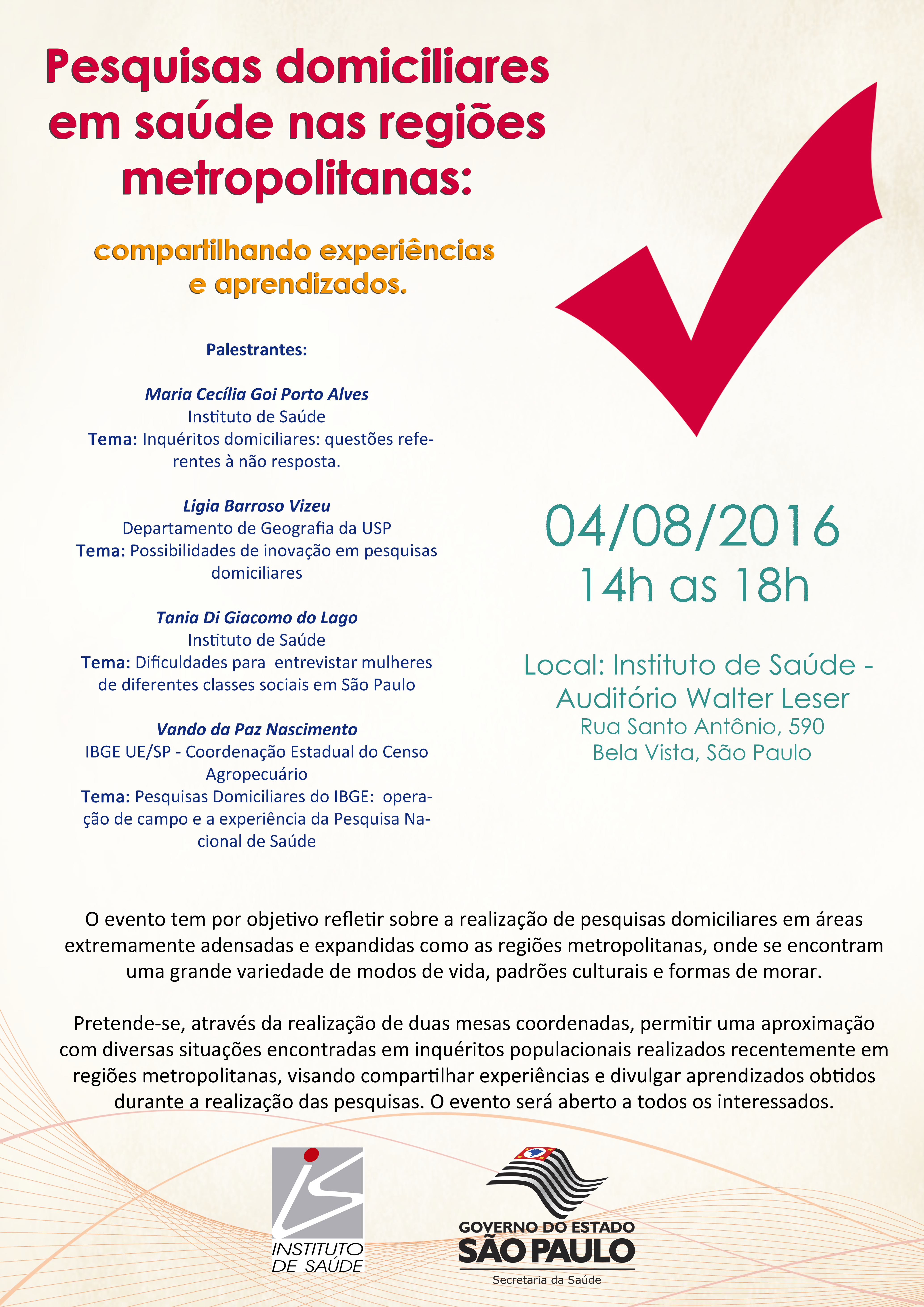 Buscando refletir sobre o impacto que os diferentes modos de vida e padrões culturais encontrados em metrópoles exercem sobre a realização de pesquisas domiciliares em saúde, o Instituto de Saúde (IS) realizará no dia 04 de agosto o seminário "Pesquisas domiciliares em saúde nas regiões metropolitanas: compartilhando experiências e aprendizados".
