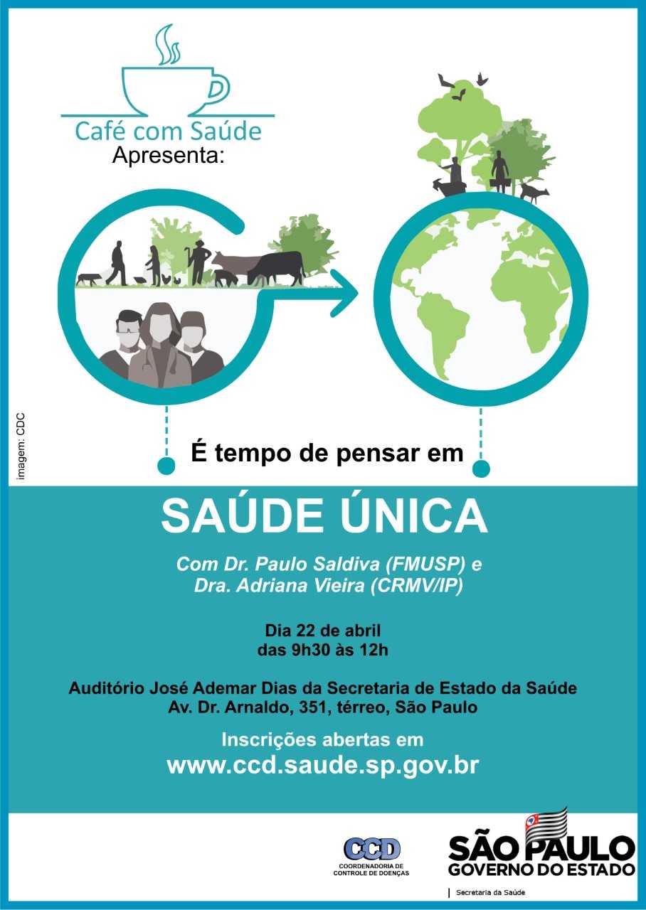 A Coordenadoria de Controle de Doenças realiza o Café com Saúde "É tempo de pensar em SAÚDE ÚNICA", dia 22 de abril, das 9h30 ás 12h, no Auditório José Ademar Dias da Secretaria de Estado da Saúde. Inscrições abertas em www.ccd.saude.sp.gov.br