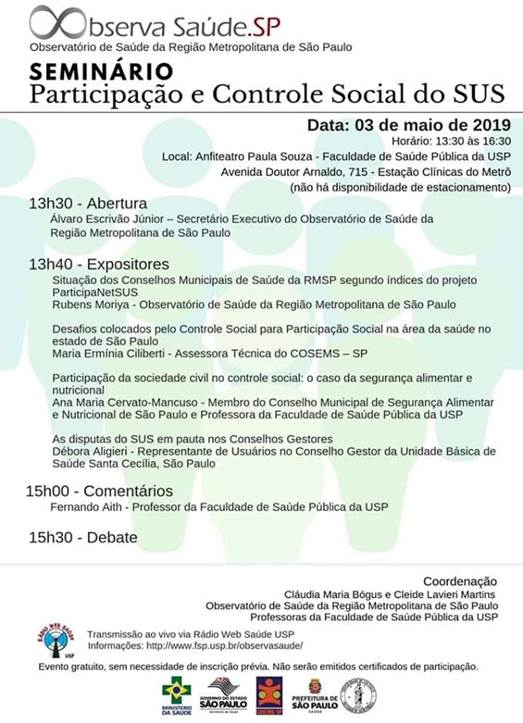 Seminário Participação e Controle Social do SUS Dia: 03/05/2019 Horário: 13h30 às 16h30 Para maiores informações clique aqui.